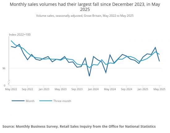 Sales volumes fell by 2.7% during May 2025, following a 1.3% rise in April. This was the largest fall on the month since December 2023. Sales volumes fell by 1.3% over the year to May 2025.