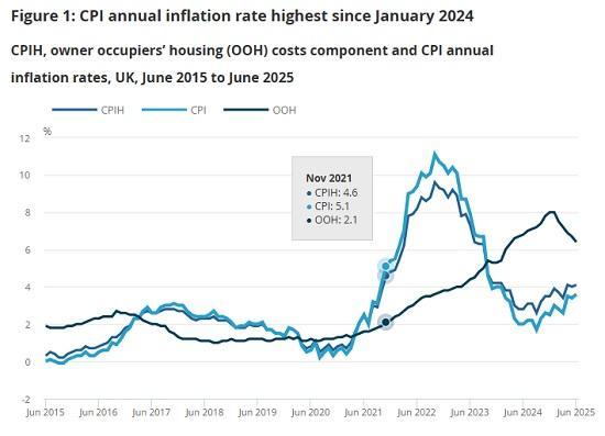 The Consumer Prices Index (CPI) rose by 3.6% in the 12 months to June 2025, up from 3.4% in the 12 months to May. The June 2025 figure was the highest recorded since January 2024, when the rate was 4.0%.