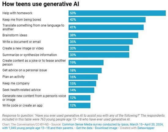 Students, on the other hand, tended to jump into the deep end of the AI pool. Common Sense Media, which offers recommendations on children's media consumption, published a report in 2024 showing that students were using AI-supported search and chatbots for homework and to stave off boredom as well as other personal reasons, including "creating content as a joke, planning activities, and seeking health advice." Most of the teachers and parents of the students in the study were unaware that students were using the technology.